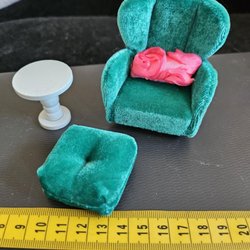 Retro Lundby. Grön plysch fåtölj med pall och tillhörande bord.