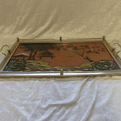 Äldre handmålat fat med fågel & blommor – dekorativt metallfat 11 cm