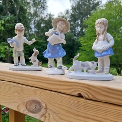 Porslinsfigurer - Pojke och Flicka med Djur blå guld vit kanin lamm får