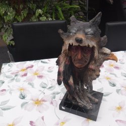 Indian skulptur med vargpäls som huvudbonad