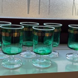 Sex gröna Luminarc starkvinsglas med guldfärgad bård, selterglas