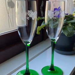 Två champagneglas, grön fot, vindruvsdekor, klassiskt mönster, France