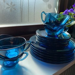Sex blå Vereco kaffekoppar med fat och assietter, France