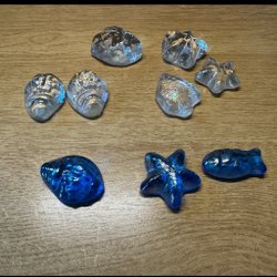 Snäckor, sjöstjärnor och fiskar, i glas, dekorationer