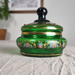 Praktfull Bonbonjär Lockask Glas Guld Röda Pärlor Italien Äldre