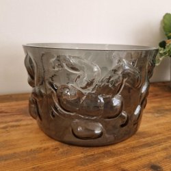 Stor fin rökfärgad skål med mönster djur, blommor, svensk glasbruk RETRO VINTAGE