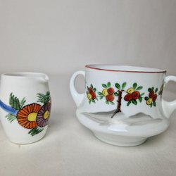 Flussglas liten kanna och skål med hänklar handmålade antik