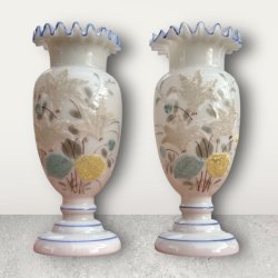 Elegant par antika glasvaser med handdekorerad emalj & krusad kant – 1800-