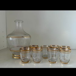 Karaff med 8 st. snapsglas. Gott skick. Karaff höjd 16 cm. Snapsglas 5 cm.