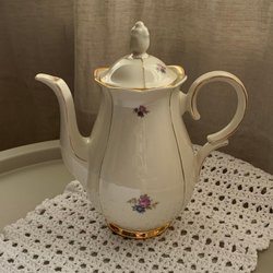 Kaffekanna Karlskrona porslinsfabrik, K P, blomdekor i rosa, blått och grönt