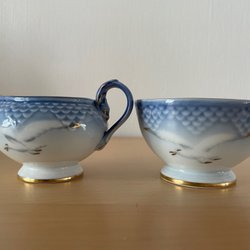 Blå Måsen kungligt dansk Gräddkanna och Sockerskål