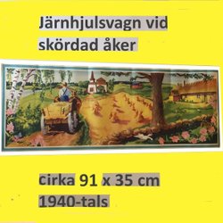 Järnhjuls-vagn, skördat fält och kyrka. 1940-50t. Stor pappersbonad. 92x35 WW578