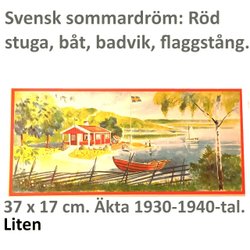 Svensk sommardröm: stuga, båt, bad, flagga. 1930-40tal.Liten pappersbonad 17x37c