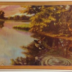 Anders Olsson: Vildand och rådjur vid höstvatten. 1950tal. Pappersbonad. 21x39cm