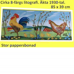 Stolt tupp med familj. FIN LITOGRAFI! Stor pappersbonad,1930-40t.39x85 Påskbonad