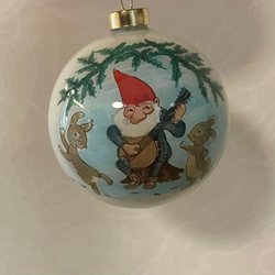 Stor vintage julgranskula med tomte motiv. Tillverkad av pappermache, jul