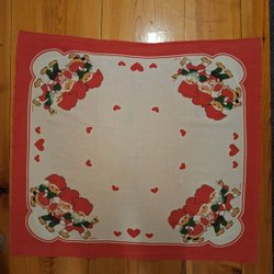 Vintage 50-60-talet Tryckt blå julduk - mönster i rött vitt grönt Linne 88x90 cm
