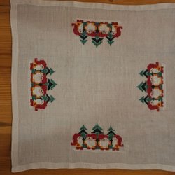 Handbroderad duk i rött linne med vita broderier 18x18 cm Litet Broderi Broderad