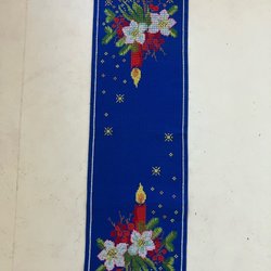 Jul Löpare Juleljus & julblommor Broderad i korsstygn på blå linneväv 83x26 cm