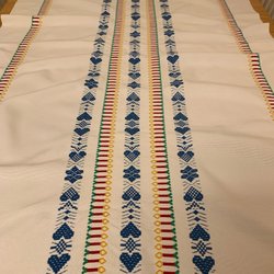 3 handbroderade löpare och en handbroderad bonad / julvepa med röd kant