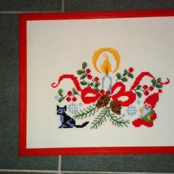 Jultavla handbroderad m röd träram 34 cm x 27 cm