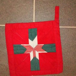 Två handbroderade grytlappar med julmotiv