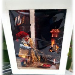 Stämningsfull tomtetavla där tomten binder kärvar vid brasa Så charmig