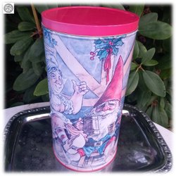 Gigantisk julburk plåtburk med julmotiv av tomtegumma och tomtefar Rare vintag