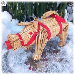 Handgjord stående fint flätad halmgris julgris med inbyggd flaska Borås hemslöjd