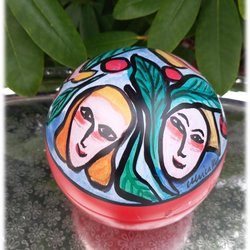 Trä tupp röd orange med färggrant mönster 1960-tal Vintage Trätupp
