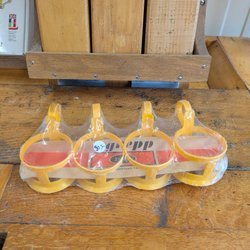 Fyra Vintage Glasunderlägg i plast, gula och röda.