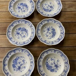 Gefle Fenix “Eden” – 6 djupa tallrikar, blåvitt fajans, ca 1910–1930