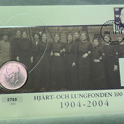 2 kronor jubilumsmynt Gustaf V 1938 i orört myntbrev Hjärt och lungfonden 100 år