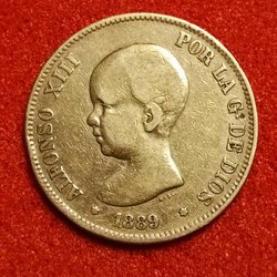1889 Spain 5 pesetas large silver coin Alfonso XIII Rey,first portrait