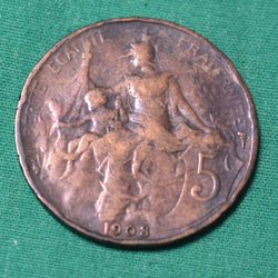 Frankrike 1908 Mynt 5 centimes Kv.6
