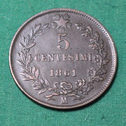 Italien 1861M Mynt 5 centesimi Kv.8