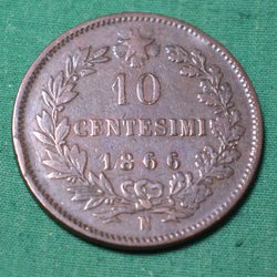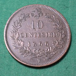 Italien 1866T Mynt 10 centesimi Kv.8