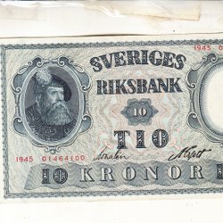 Sedel 10 kronor 1945 slutar 00 kontrollsignatur baksida 1+/01