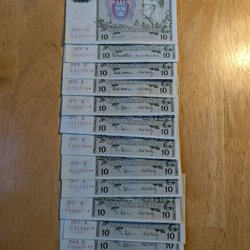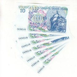Sedel 10 kronor 1968 jubileum 7 styck i nummerföljd ovikta topp ca 0