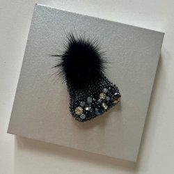 Handgjord Pärlbroch i Form av Mössa med Fuskpälsboll