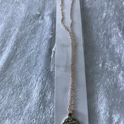 Långt guldfärgat halsband med vackert hänge med sten och hängande kedjor (5209)