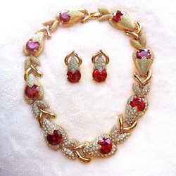 Guldfärgat halsband och örhängen med röda stenar