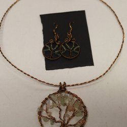 Halsband och örhängen av koppar, sten och pärlor