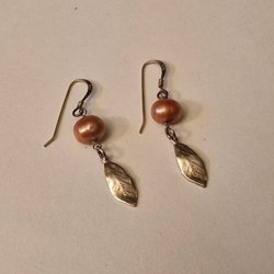Vackra Örhängen med Persikofärgade Pärlor & Bladhänge – Sterling Silver (925)