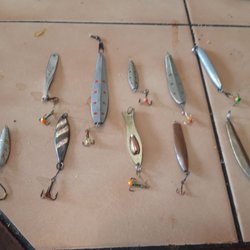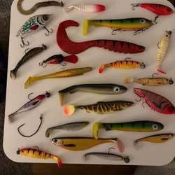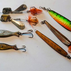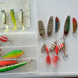 Fiskedrag och tyngder i olika färger och storlekar