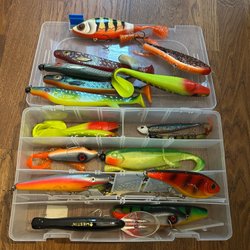 Fiskedrag och tillbehör i förvaringslåda