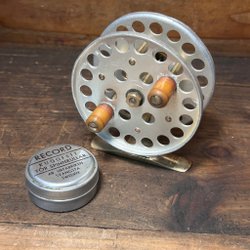 Vintage flugfiske rulle i fint skick, samt en liten burk record kuggfett