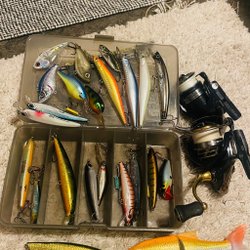 Fiskelåda med olika beten och 2 fiskerullar