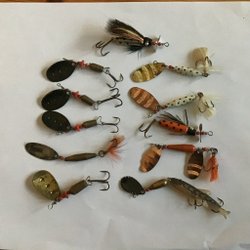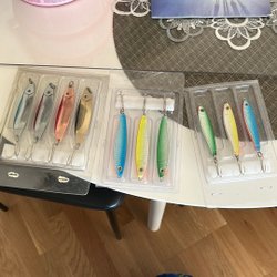 Fiskelåda i bra skick full med wobbler, drag, spinnare och jiggar