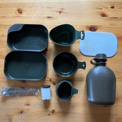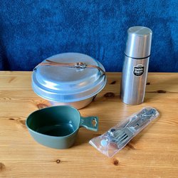 Tallrikslåda, kåsa, fältflaska, campingset